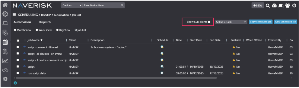 Users can now toggle a Show Sub-Clients option within the Job List tab of the Scheduling page. This allows for a consolidated view of all scheduled tasks across a parent client and its associated sub-entities.